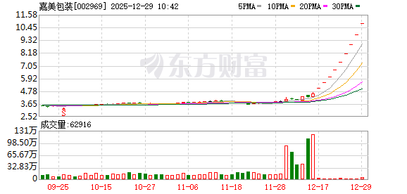 嘉美包装盘中涨停,已连收9个涨停板,截至9:43,该股报10.77元,换手率0.48%,成交量454.97万股,成交金额4900.05万元,涨停板封单金额为11.21亿元。连续涨停期间,该股累计上涨136.18%,累计换手率为2.99%。最新A股总市值达102.90亿元,A股流通市值102.24亿元。