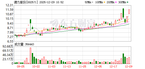 德力股份再度涨停,5个交易日内录得3个涨停,累计涨幅为15.97%,累计换手率为61.88%。截至10:05,该股今日成交量3452.87万股,成交金额3.89亿元,换手率11.57%。最新A股总市值达45.54亿元,A股流通市值34.66亿元。
